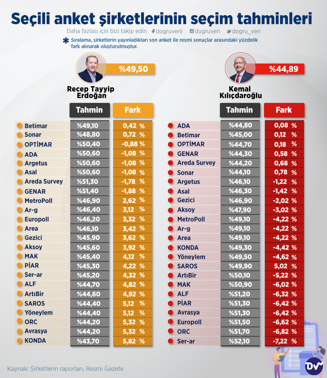 Şirketlerin Recep Tayyip Erdoğan ve Kemal Kılıçdaroğlu’nun alacağı oy oranı tahminine göre iki farklı sıralama yaptık. Buna göre Recep Tayyip Erdoğan’ın aldığı oya en yakın tahmin yapan şirketler Betimar, Sonar, OPTİMAR olurken Kemal Kılıçdaroğlu’nun aldığı oya en yakın tahmin yapan şirketler ADA, Betimar ve OPTİMAR oldu.