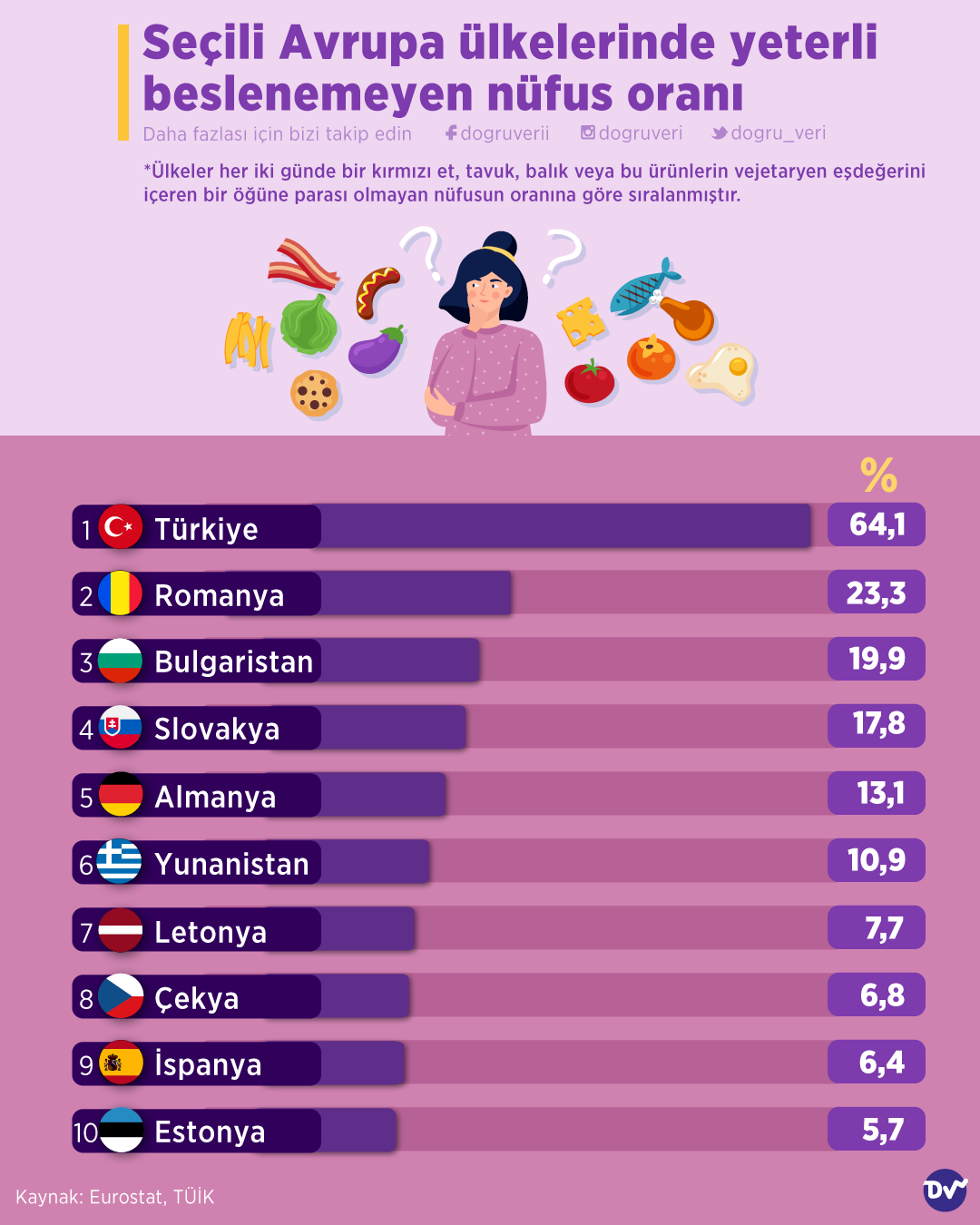 Eurostat ve TÜİK’ten aldığımız verilere göre, 2023’te seçili Avrupa ülkelerinde yeterli beslenemeyen nüfus oranlarını derledik. Ülkeler her iki günde bir kırmızı et, tavuk, balık veya bu ürünlerin vejetaryen eşdeğerini içeren bir öğüne parası yetmeyen nüfusun oranına göre sıralandı. Buna göre Türkiye’de yeterli beslenemeyen nüfusun oranı %64,1 iken ona en yakın ülke %23,3 ile Romanya oldu.