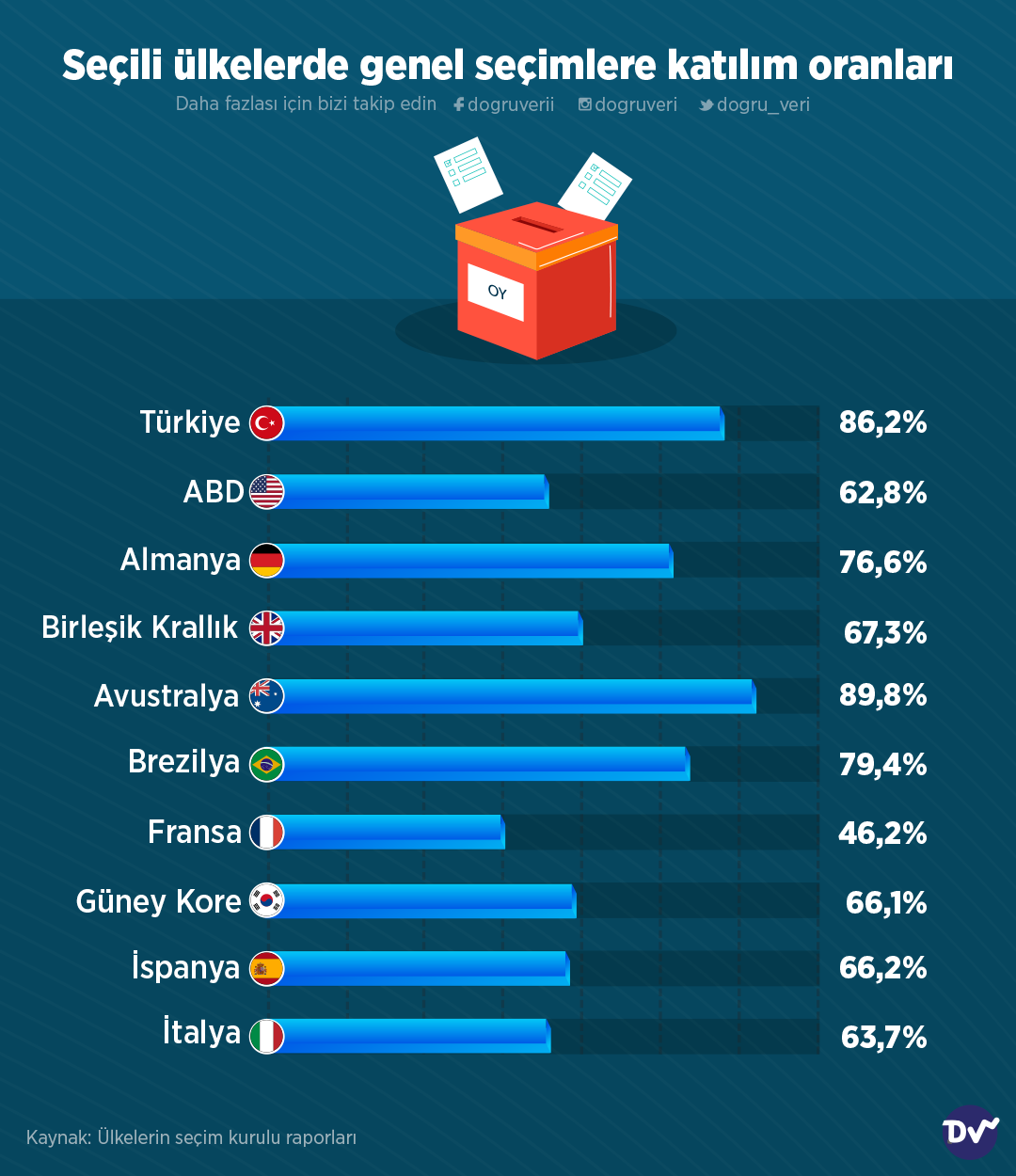 Ülkelerin son parlamento seçimlerini baz alarak genel seçimlere katılım oranlarını derledik. Derlemedeki ülkelerin katılım oranları şu şekilde: Türkiye yüzde 86,2, ABD yüzde 62,8, Almanya yüzde 76,6, Birleşik Krallık yüzde 67,3, Avustralya yüzde 89,8, Brezilya yüzde 79,4, Fransa yüzde 46,2, Güney Kore yüzde 66,1, İspanya yüzde 66,2 ve İtalya yüzde 63,7.