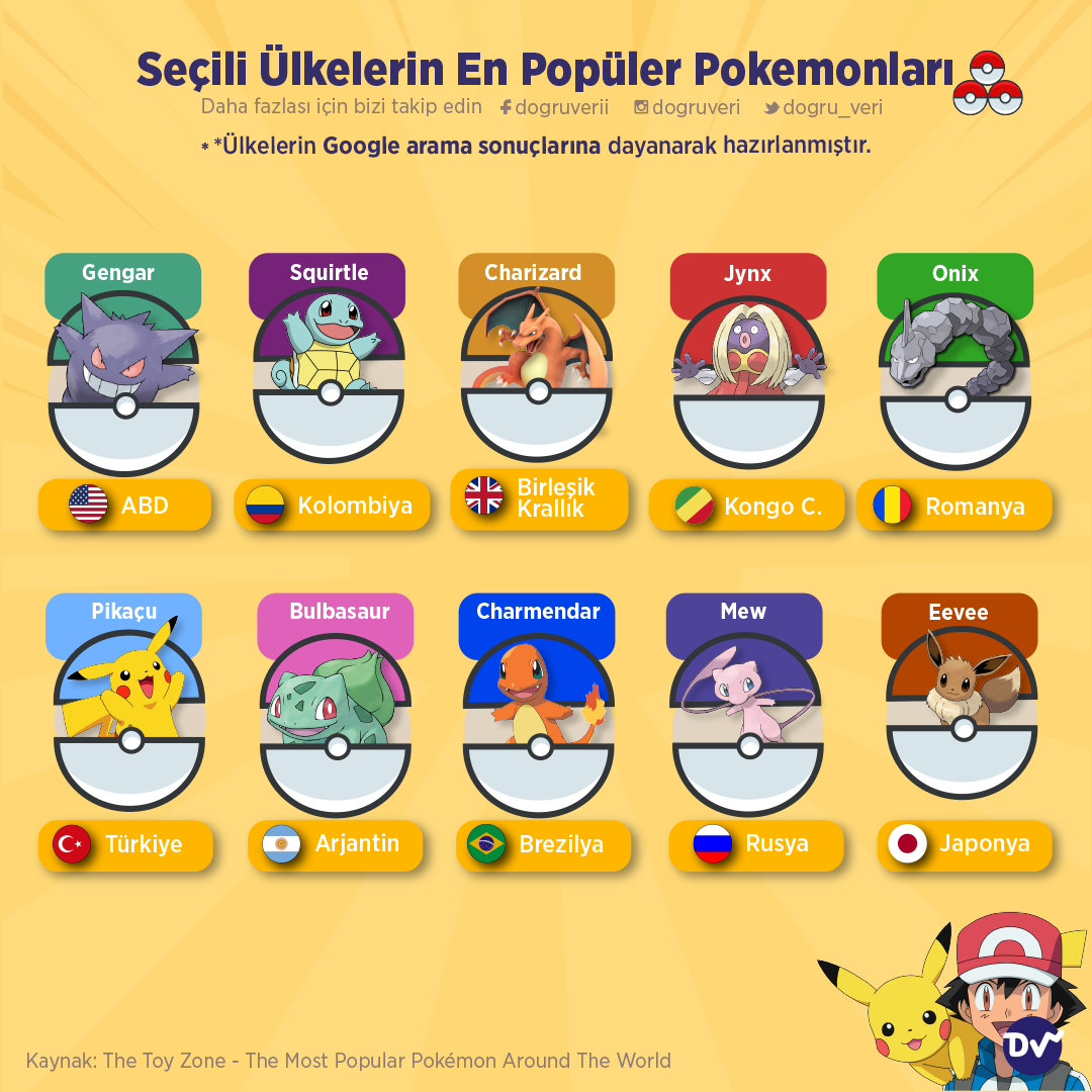 AnasayfaKültür & SanatSeçili ülkelerin en popüler pokemonlarıKültür & Sanat Seçili ülkelerin en popüler pokemonları Paylaş Seçili ülkelerdeki en popüler Pokemonlar listesini derledik. Liste, ülkelerin Google arama sonuçlarının analizleri kapsamında hazırlandı. Türkiye’nin de yer aldığı listede en popüler pokemon Pikaçu olarak listede yerini alıyor. 84 Paylaş