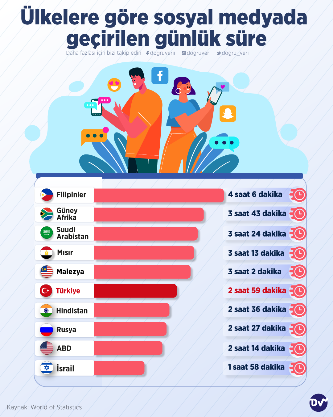 AnasayfaBilim & TeknolojiSeçili ülkelerin sosyal medyada geçirdiği süreBilim & Teknoloji Seçili ülkelerin sosyal medyada geçirdiği süre Paylaş Ülkelerin sosyal medyada ne kadar zaman harcadıklarını araştırdık. Araştırmaya göre listenin başında 4 saat 6 dakika ile Filipinler yer alıyor. Türkiye’de ise sosyal medya kullanıcıları, günlerinin 2 saat 59 dakikasını sosyal medyada geçiriyorlar. 108 Paylaş