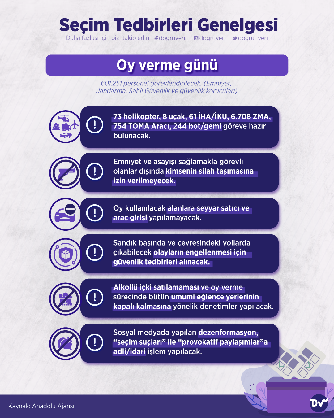 Cumhurbaşkanlığı ve 28. Dönem Milletvekili Genel Seçimleri bugün yapılıyor. İçişleri Bakanlığı’nın yayımladığı genelgeye göre Seçim güvenliği kapsamında, 601 bin 251 güvenlik personeli görevlendirildi. Seçim güvenliği tedbirleri kapsamında; sandık başında ve çevresindeki yollarda çıkabilecek olayların engellenmesi için güvenlik tedbirleri alınacağı da belirtilmiş.