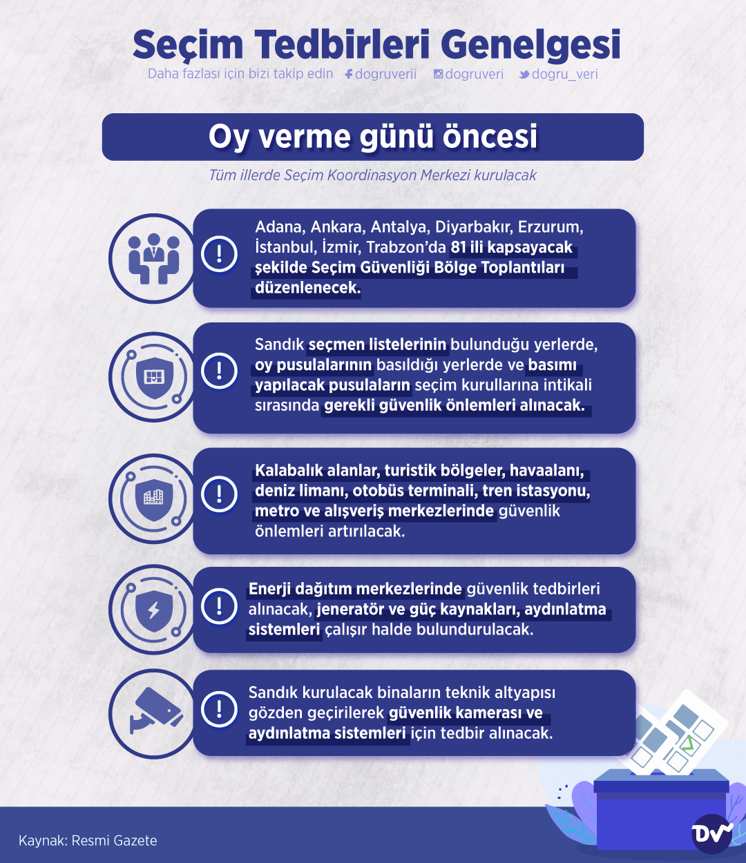 AnasayfaSiyaset & PolitikaSeçim Tedbirleri GenelgesiSiyaset & PolitikaSeçim 2023 Seçim Tedbirleri Genelgesi Paylaş Resmi Gazete’de yayınlanan Seçim Tedbirleri Genelgesi’ne göre oy verme günü öncesinde yapılacakları derledik. 28 Paylaş