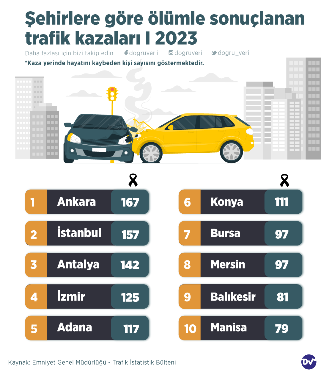 Şehirlere göre ölümle sonuçlanan trafik kazaları I 2023