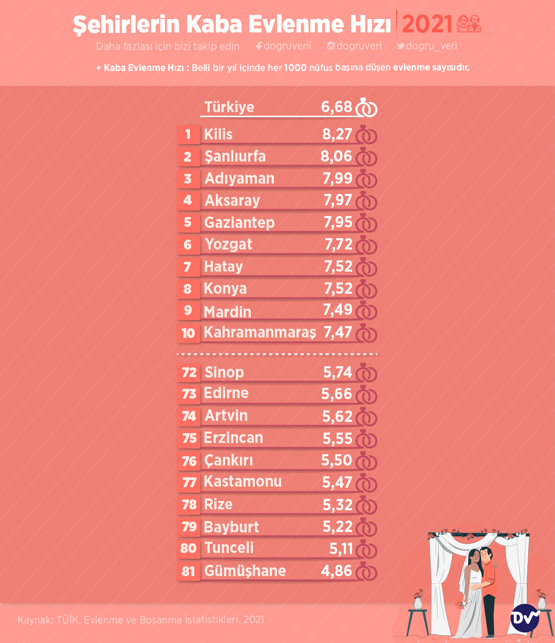 Kaba evlenme hızının en yüksek olduğu şehirlere baktığımızda en üst sırada Kilis’i, Şanlıurfa’yı ve Adıyaman’ı görüyoruz. En düşük orana sahip şehirlere baktığımızda ise Karadeniz bölgesinin çoğunlukta olduğunu görüyoruz: Kastamonu, Rize, Bayburt, Tunceli ve Gümüşhane.