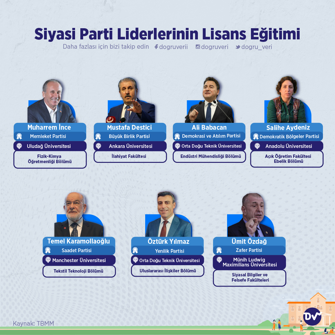 Türkiye Büyük Millet Meclisi’nin 27. döneminde mecliste yer alan siyasi parti liderlerinin aldıkları lisans eğitimlerini, TBMM’deki özgeçmişlerinden yararlanarak siyasi parti liderlerinin aldıkları lisans eğitimlerini derledik. Buna göre siyasi parti liderlerinin aldıkları lisans eğitimlerinde en yaygın bölümler arasında Ekonomi/Ticaret/İktisat bulunurken Tekstil Teknolojisi, Tarih ve Fizik-Kimya Öğretmenliği gibi farklı bölümler de yer alıyor.