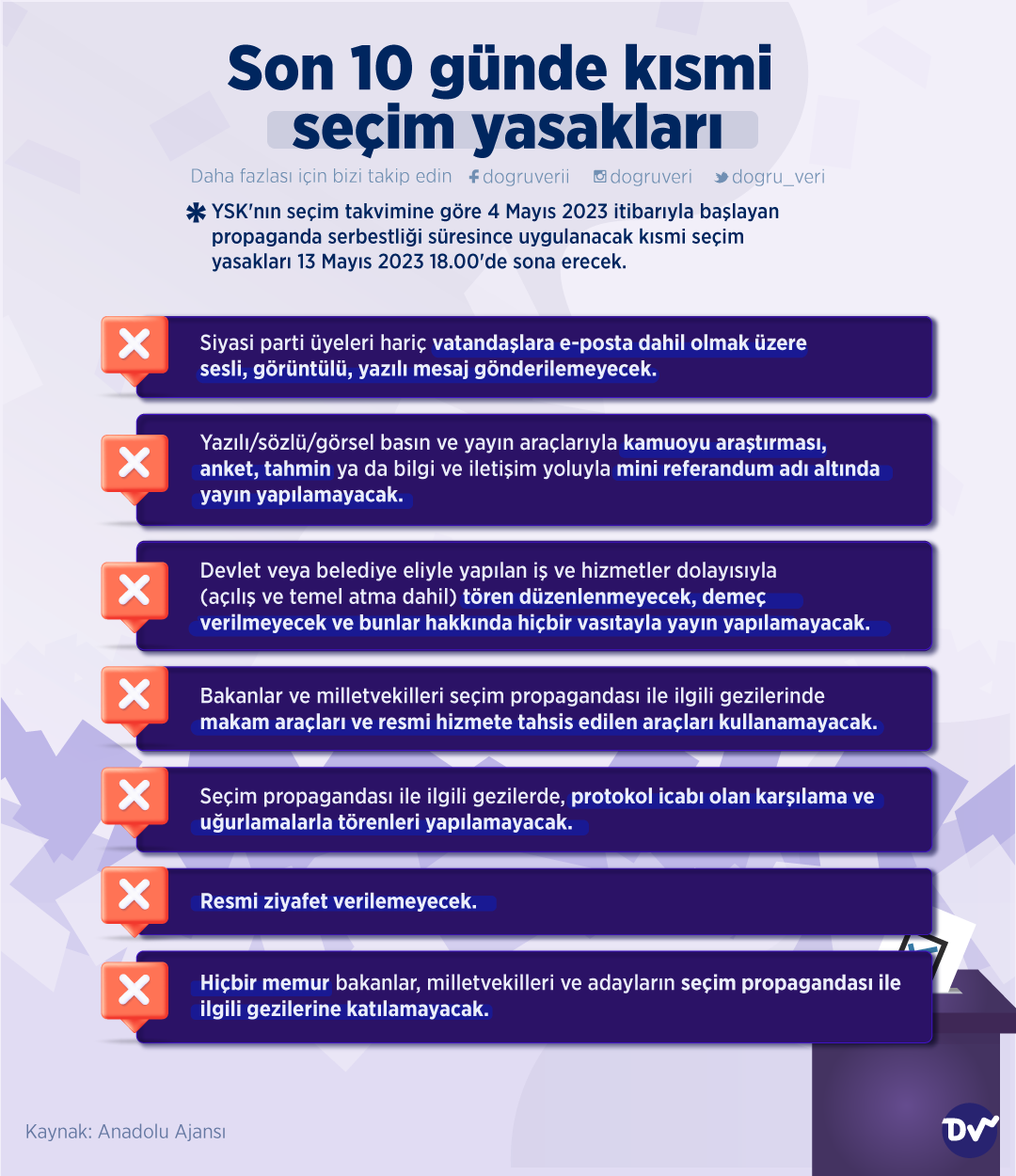 AnasayfaSeçim 2023Son 10 günde kısmi seçim yasaklarıSeçim 2023Siyaset & Politika Son 10 günde kısmi seçim yasakları Paylaş Yüksek Seçim Kurulu’nun (YSK) seçim takvimine göre propaganda serbestliği ve bir kısım seçim yasakları seçime 1o gün kala, 4 Mayıs 2023 itibarıyla başladı. Bu kapsamda başlayan yasaklar 13 Mayıs 2023 günü saat 18.00’de son bulacak. 51 Paylaş