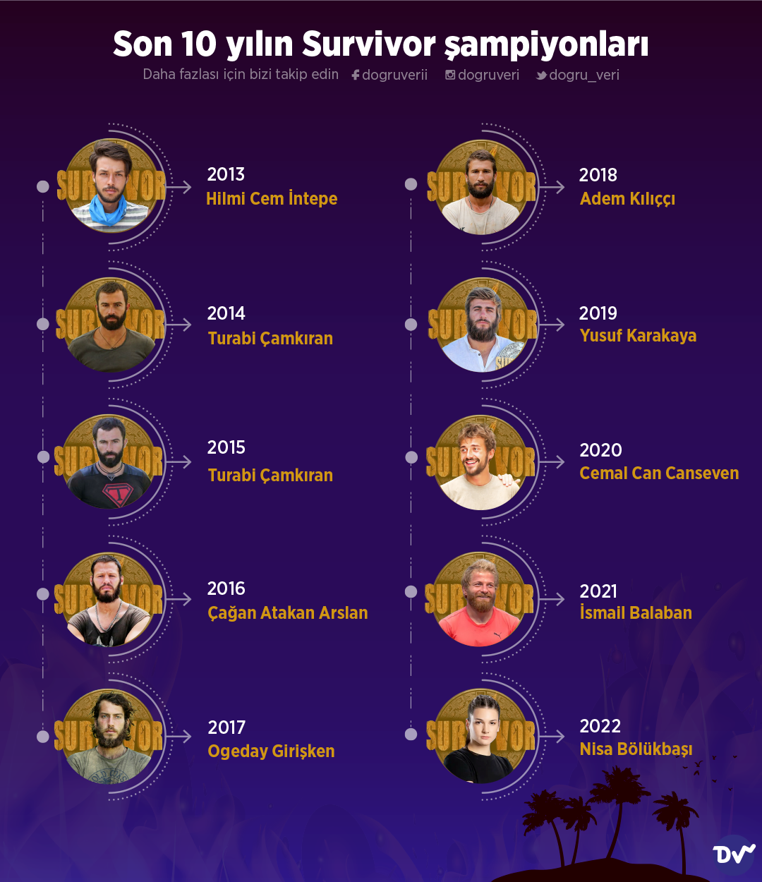 Son 10 yılın Survivor şampiyonlarını derledik. Derlemeye göre şampiyonlar şu şekilde sıralandı: 2013’de Hilmi Cem İntepe, 2014 ve 2015’de Turabi Çamkıran, 2016’da Çağan Atakan Arslan, 2017’de Ogeday Girişken, 2018’de Adem Kılıççı, 2019’da Yusuf Karakaya, 2020’de Cemal Can Canseven, 2021’de İsmail Balaban ve 2022’de Nisa Bölükbaşı.