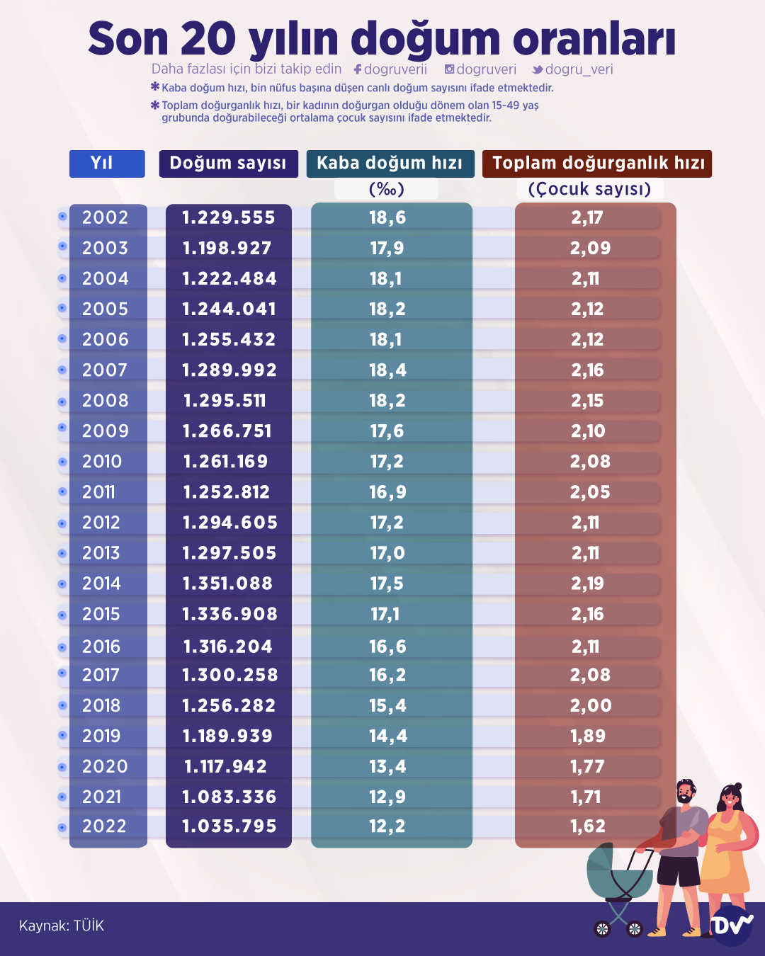 AnasayfaNüfusSon 20 yılın doğum oranlarıNüfus Son 20 yılın doğum oranları Paylaş Son 20 yıla ait doğum verilerini derledik. İnfografiğe bakıldığında doğum sayısının, kaba doğum hızının ve toplam doğurganlık hızının genellikle düşüşte olduğu görülüyor. En son 2022 yılına ait doğum sayısı ise 1.035.795. 409 Paylaş