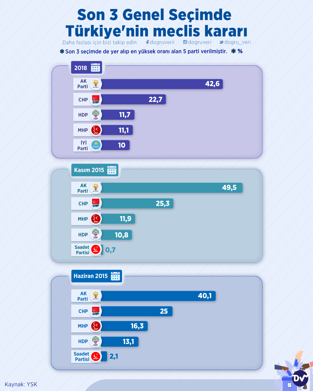 AnasayfaSeçim 2023Son 3 Genel Seçimde Türkiye’nin meclis kararı I 2015-2018Seçim 2023 Son 3 Genel Seçimde Türkiye’nin meclis kararı I 2015-2018 Paylaş Son üç genel seçim sonucunda mecliste yer alan ilk 5 partinin oy oranlarını derledik. Buna göre 2018 seçiminde AK Parti’nin ve CHP’nin Kasım 2015’e göre oy kaybettiğini söyleyebiliriz. 8 Paylaş