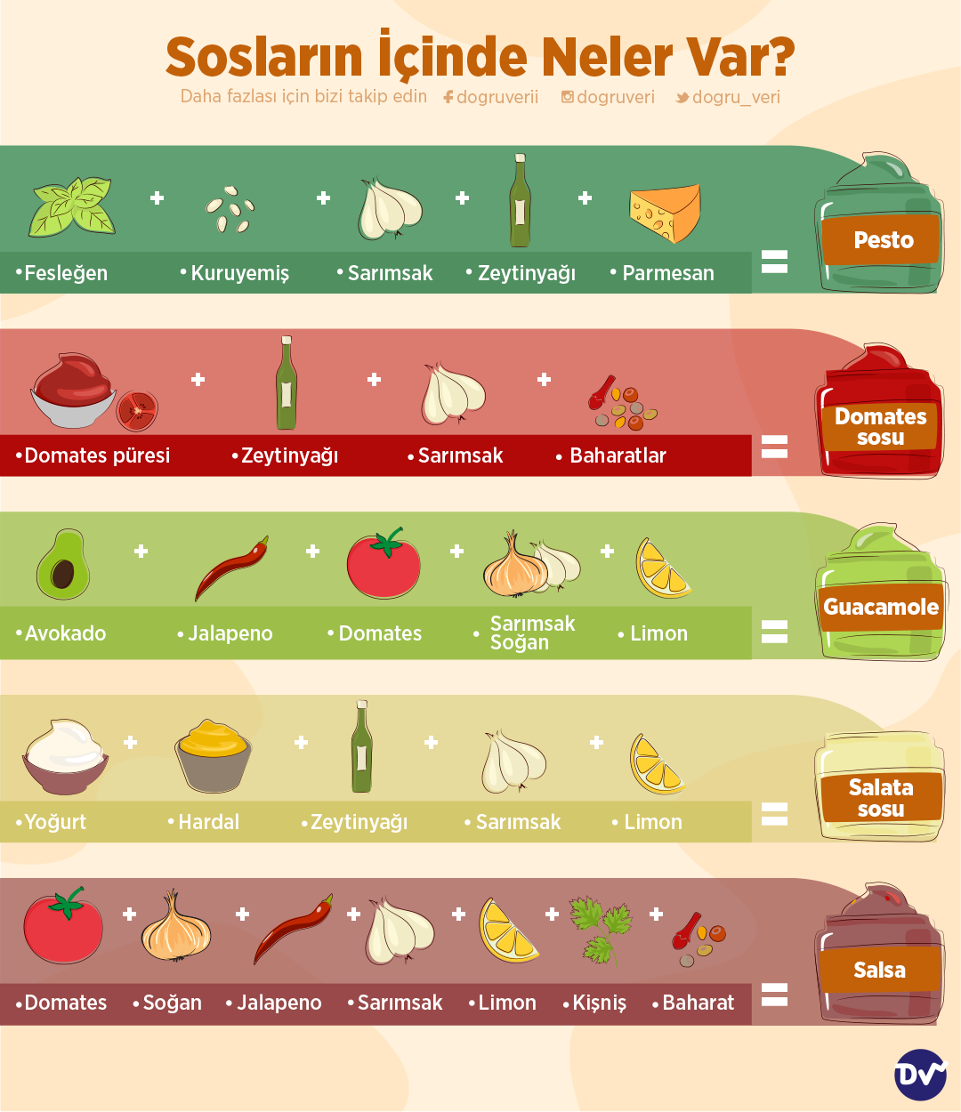 AnasayfaDiğerSosların içinde neler var?DiğerÜretim & Tüketim Sosların içinde neler var? Paylaş Pesto, domates sosu, guacamole, salsa ve salata soslarının içinde hangi malzemelerin olduğunu derledik. 31 Paylaş