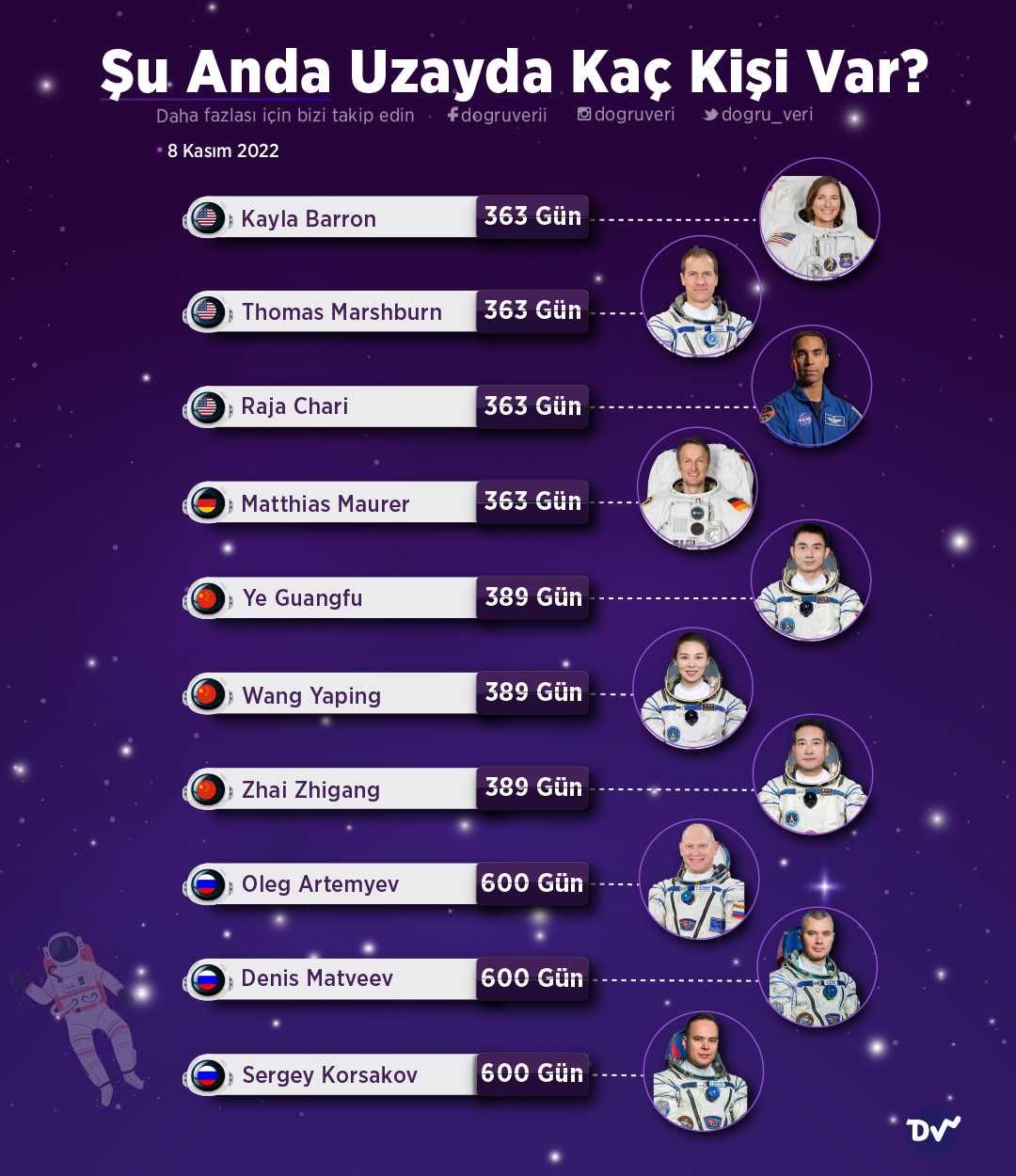 Rus astronotlar Oleg Artemyev, Denis Matveev ve Sergey Korsakov 600 gündür uzayda. Çinli astronotlar Zhai Zhigang, Wang Yaping e Ye Guanfu 289 gündür dünyadan uzakta. Amerikalı Kayla Barron, Thomas Marshburn, Raja Charl ve Alman Mathias Maurer ise 363 gündür uzayda.