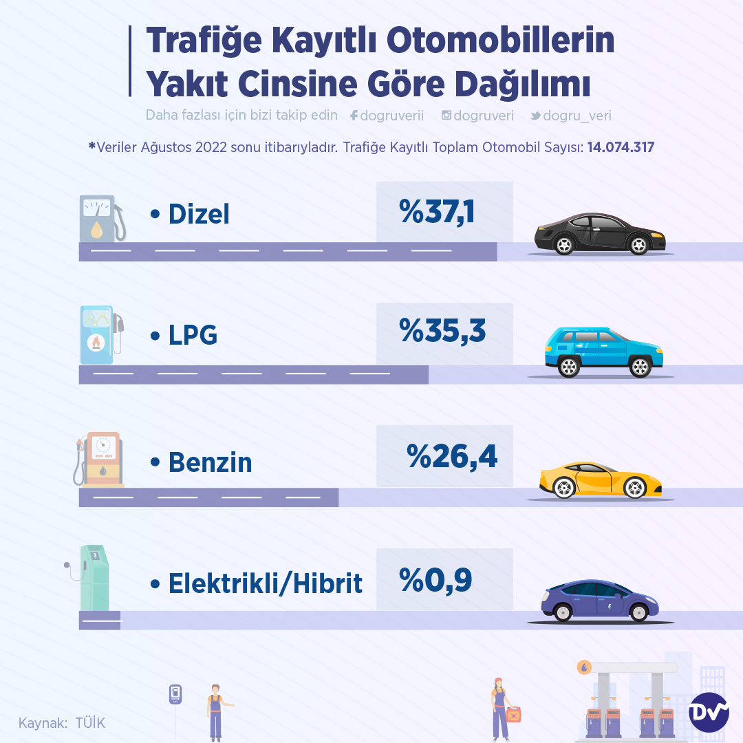 TÜİK, trafiğe kayıtlı otomobillerin yakıt cinslerine göre dağılımını gösteren Ağustos 2022 raporunu yayımladı. Rapora göre trafiğe kayıtlı toplam 14 milyar 74 bin 317 otomobil var. Bunların %37,1’ dizel, %35,3’ü LPG, %26,4’ü benzin kullanırken %0,9’u ise elektrikli/hibrit araçlar.