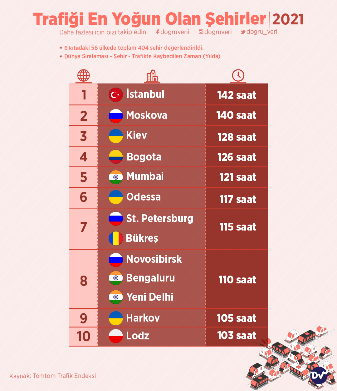 Tomtom Trafik Endeksi, en yoğun trafiğe sahip ülkelerin bir listesini veriyor. 2021 verileriyle oluşturulan listede trafikte kaybedilen zamana da yer veriliyor. 6 kıtadaki toplam 58 ülke ve 404 şehri içine alan bu veriye göre trafikte en çok vakit kaybedilen şehir İstanbul.