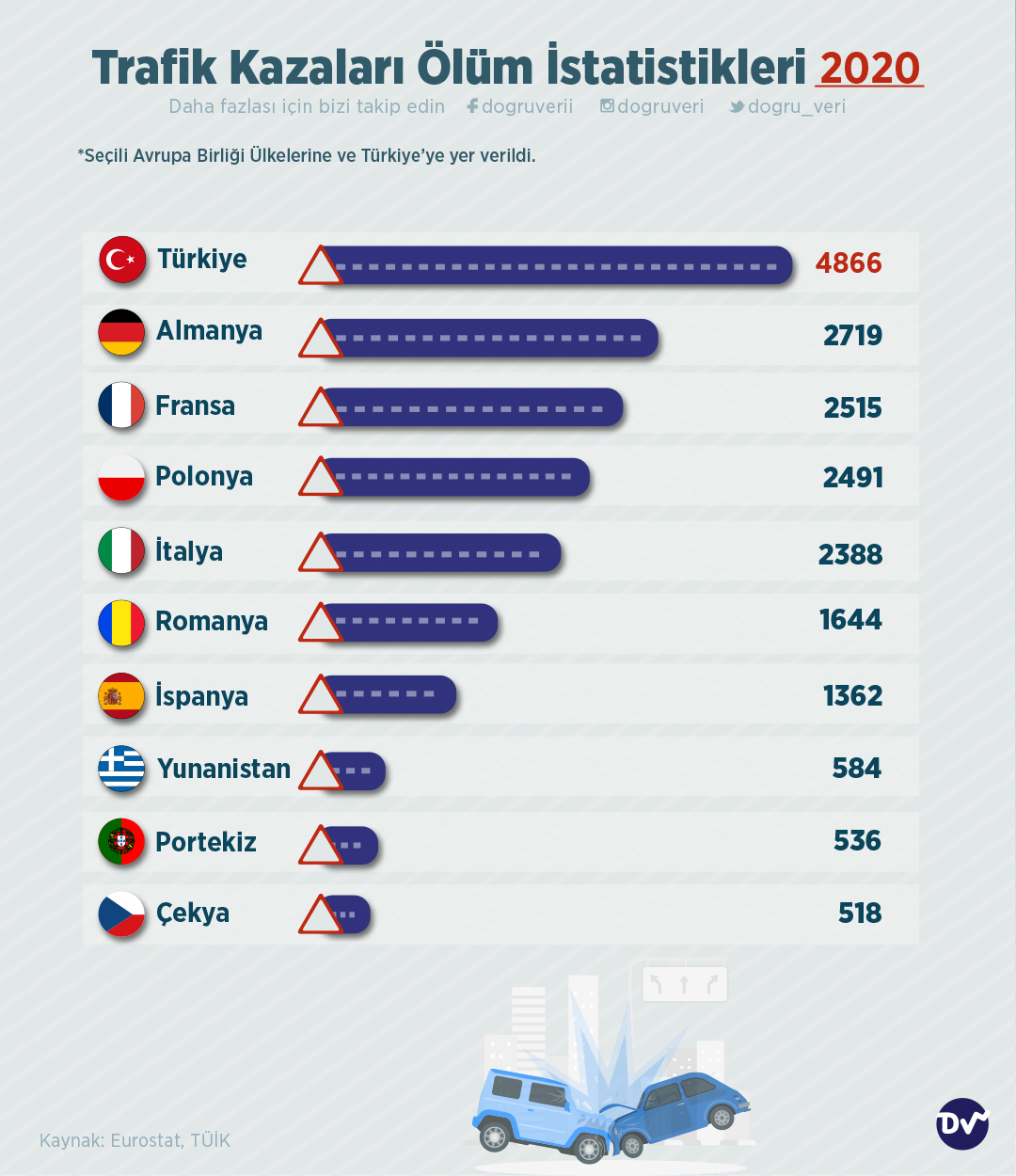 Trafik kazaları istatistiklerini inceleyerek hazırladığımız veriye göre 2020 yılında Avrupa ülkeleri içerisinde trafik kazalarının en çok ölümle sonuçlandığı ülke Türkiye. 2020 yılında 4866 kişi, trafik kazası sonucu ölmüş. Türkiye’ye en yakın ölüm sayısı 2719 kişi ile Almanya. Onu Fransa ve Polonya takip ediyor.