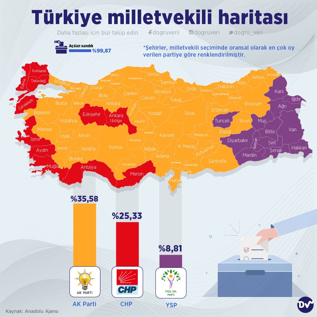 AnasayfaSeçim 2023Türkiye milletvekili haritasıSeçim 2023Siyaset & Politika Türkiye milletvekili haritası Paylaş En çok oy alan partiye göre Türkiye haritasını renklendirdik. Türkiye genelinde AK Paeti %35,58 oy alırken CHP %25,33 oranında oy aldı. 203 Paylaş