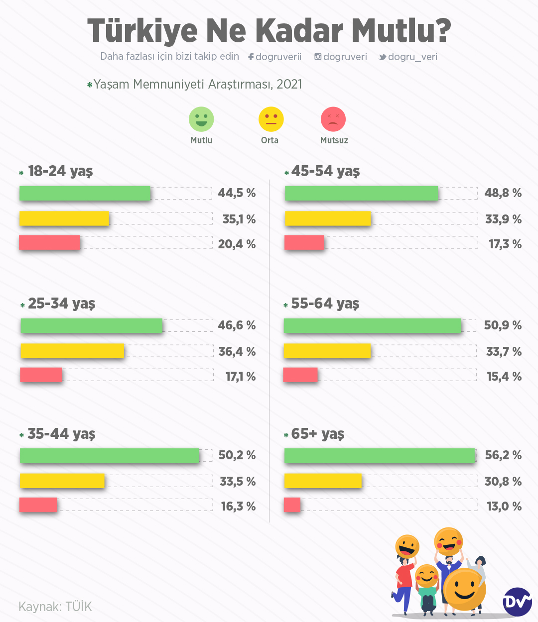 AnasayfaNüfusTürkiye ne kadar mutlu?Nüfus Türkiye ne kadar mutlu? Paylaş Yaşam Memnuniyeti Araştırması’nda belirli yaş aralıklarının mutluluk oranları paylaşıldı. Verilere göre en mutlu yaş grubu %56,2 oranıyla 65 yaş üstünde olan vatandaşlar. En mutsuz olan grup ise, %20,4 oranıyla 18-24 yaş grubu. 99 Paylaş