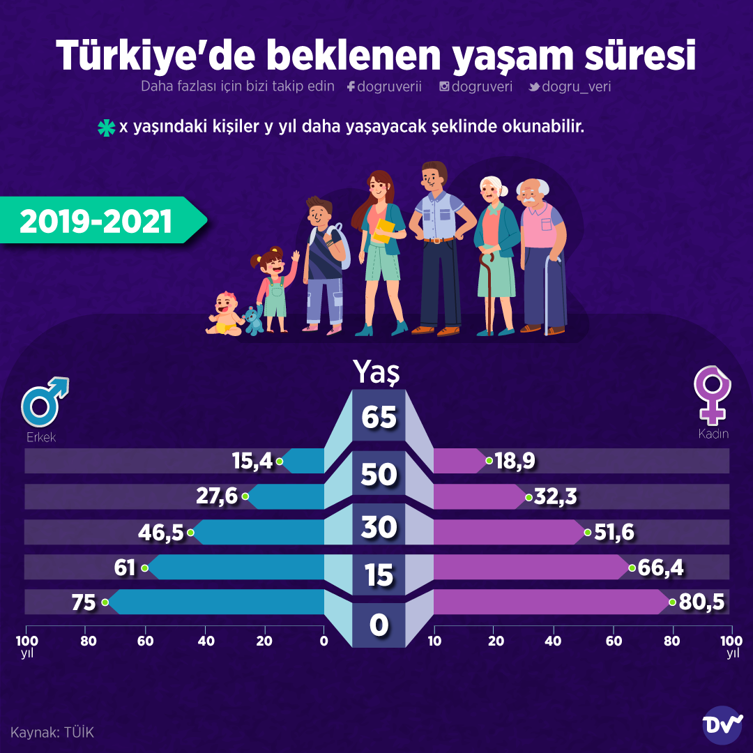 AnasayfaDiğerTürkiye’de beklenen yaşam süresiDiğer Türkiye’de beklenen yaşam süresi Paylaş TÜİK tarafından açıklanan verilere göre Türkiye’de beklenen yaşam süresi grafiğini derledik. Buna göre 2019-2021 yılları arasına bakıldığında genel olarak kadınların erkeklerden daha uzun süre yaşadığı görülüyor. 86 Paylaş