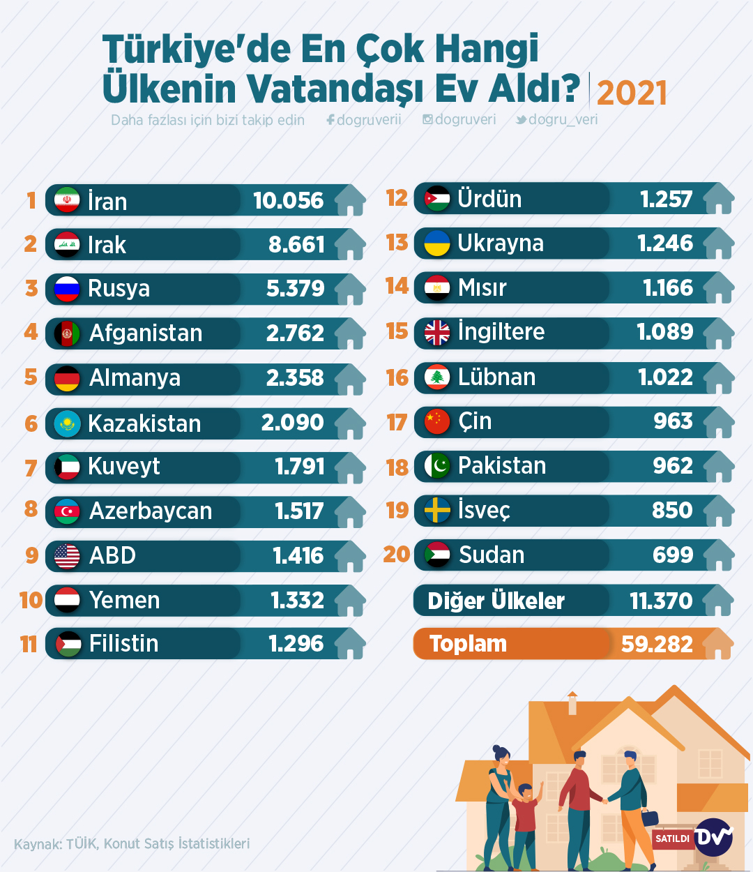 TÜİK’in 2021 Konut Satış İstatistikleri raporuna göre Türkiye’den ev alan yabancılar arasında en üst sırada 10 bin 56 kişi ile İran vatandaşları geliyor. Irak, Rusya, Afganistan ve Almanya vatandaşları da ilk 5’in kalan kısmını oluşturuyor.