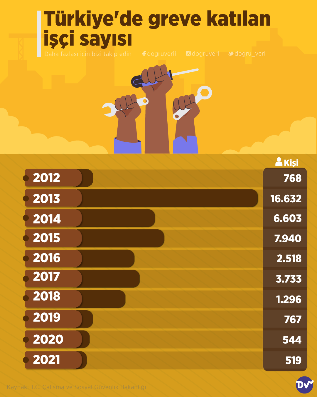 AnasayfaÜretim & TüketimTürkiye’de greve katılan işçi sayısıÜretim & Tüketim Türkiye’de greve katılan işçi sayısı Paylaş T.C. Çalışma ve Sosyal Güvenlik Bakanlığı’nın verilerine göre 2012 ve 2021 yılları arasında greve katılan işçilerin sayısını derledik. 71 Paylaş
