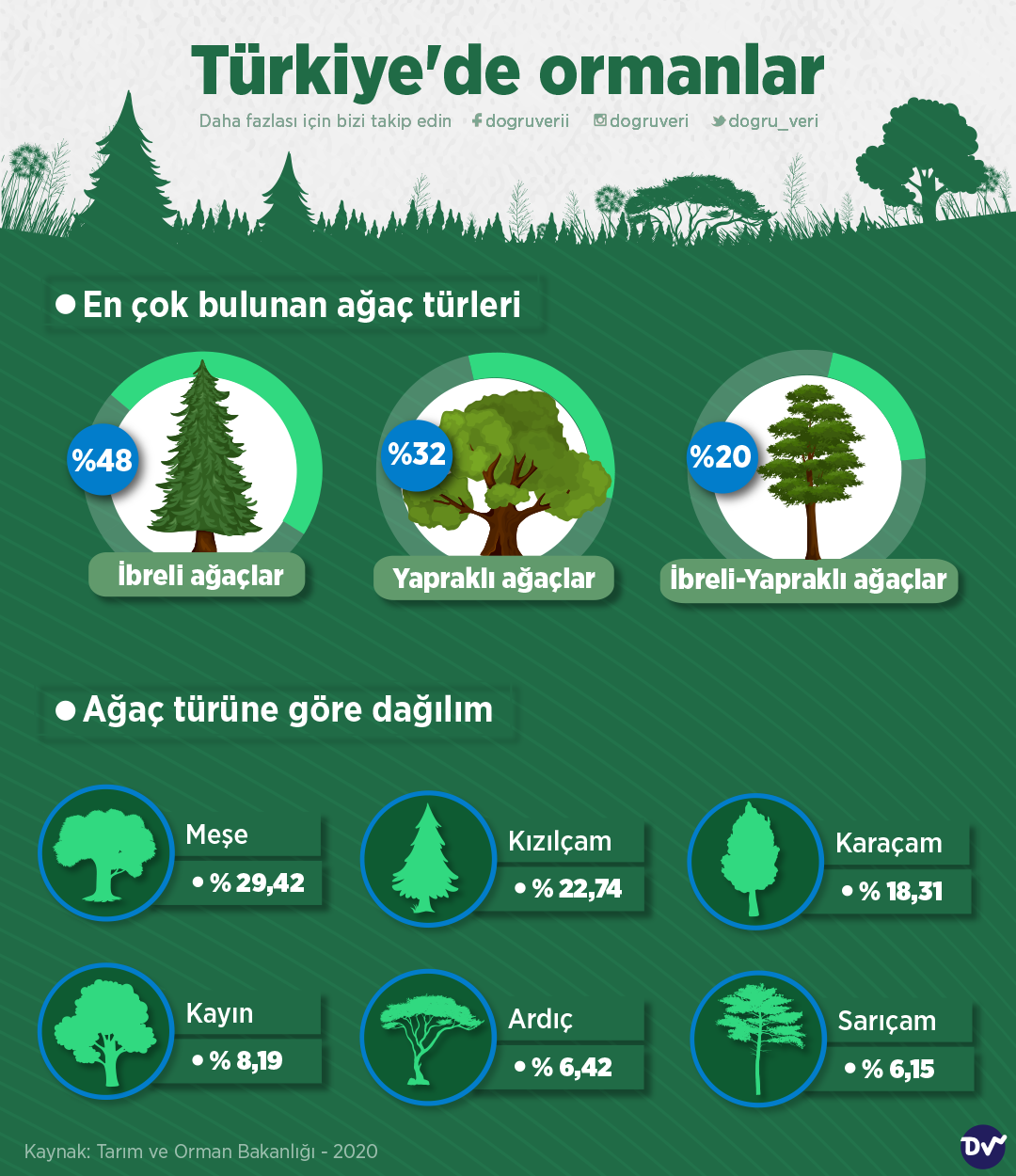 21-26 Mart Orman Haftası nedeniyle Türkiye’de en çok bulunan ağaç türlerini ve ağaç türüne göre dağılımını sizler için derledik. Buna göre, %48 ile i ibreli ağaçlar, %32 ile yapraklı ağaçlar ve %20 ile ibreli-yapraklar ağaçlar en çok bulunan ağaç türlerini oluşturuyor.