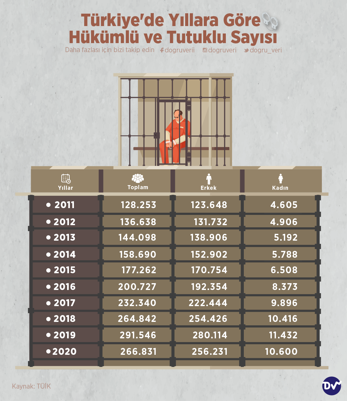 TÜİK’in raporuna dayanarak hazırladığımız bu veride, Türkiye’nin 2011-2020 aralığındaki hükümlü ve tutuklu sayısına ulaşabiliyorsunuz. Toplam hükümlü sayısı, 2011’de 128,253 iken bu sayı 2020 yılında 266.831’e çıkmış. Cinsiyetlere göre hükümlü sayısına baktığımızda ise kadın hükümlü sayısının erkeklere nazaran çok çok düşük olduğunu görebiliyoruz.