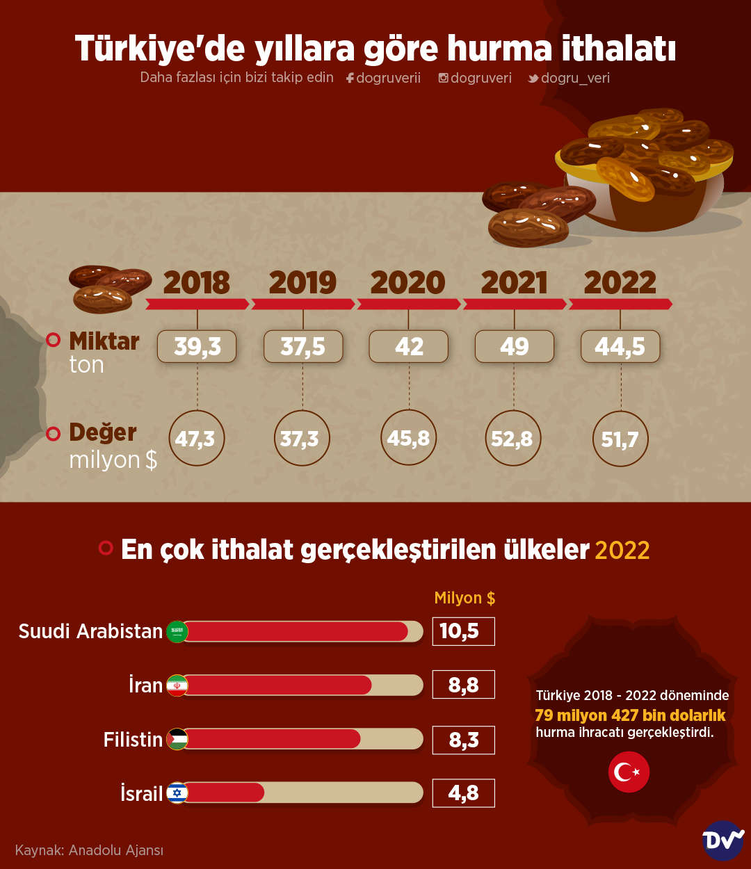 Türkiye’nin 2018 ve 2022 yılları arasında yaptığı hurma ithalatını derledik. Buna göre, 2018 yılında 39,3 ton hurma ithalatı yapıldığı görülürken 2022 yılında ise 44,5 ton hurma ithalatı yapıldığı görülüyor. Hurma ithalatının en çok gerçekleştirildiği ülke ise Suudi Arabistan olmuş.