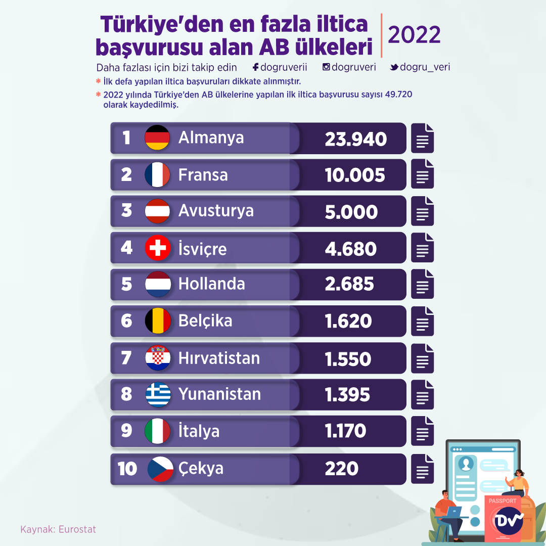 Eurostat’ın verilerine göre 2022 yılında Türkiye’den en fazla iltica başvurusu alan AB ülkelerini listeledik. İlk defa yapılan iltica başvurularını dikkate alındığı bu listeye göre geçtiğimiz yıl Türkiye’den AB ülkelerine yapılan ilk iltica başvurusu sayısı 49.720 oldu. Listenin başında gelen ülkelerse Almanya, Fransa ve Avusturya.