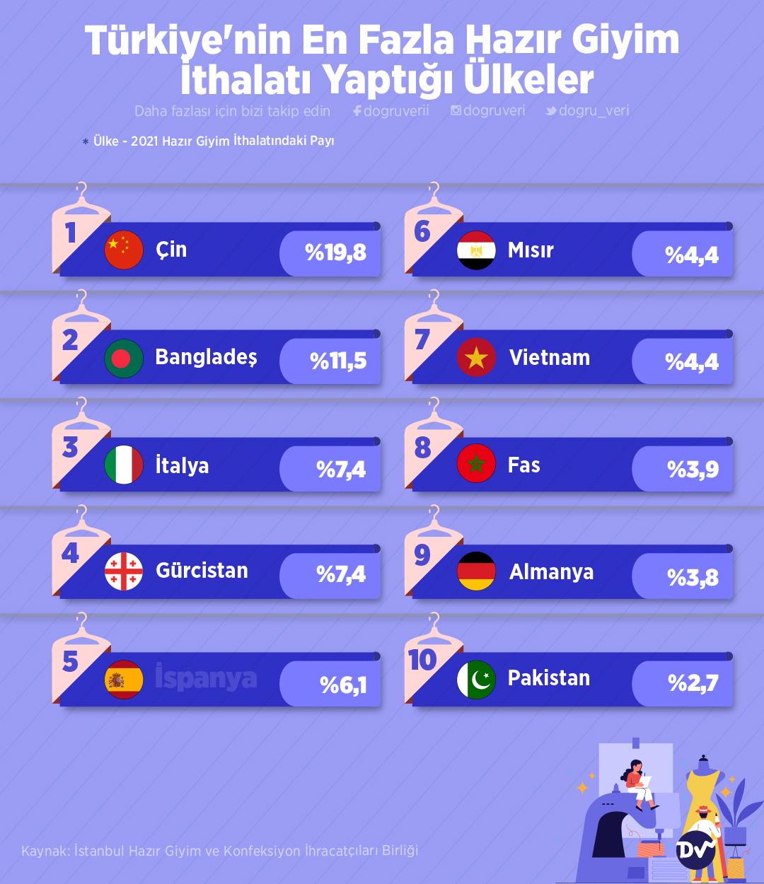 İstanbul Hazır Giyim ve Konfeksiyon İhracatçıları Birliği’nin raporu, Türkiye’nin en fazla hazır giyim ithalatı yaptığı ülkeleri ithalat oranıyla birlikte veriyor. Bu rapora göre 2021 yılında hazır giyim ithalatının %19,8’ini Çin, %11,5’ini Bagladeş, %7,4’ü ise İtalya ile yapılmış.