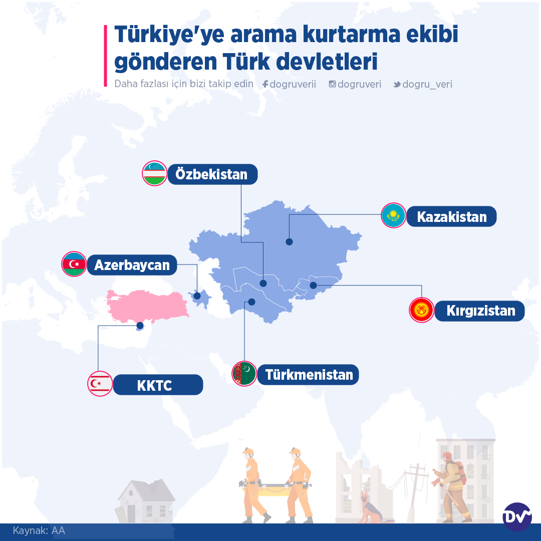Kahramanmaraş merkezli depremlerin ardından dünyanın birçok ülkesinden arama kurtarma ekipleri Türkiye’ye destek için bölgeye gelerek çalışmalarda bulundu. Türkiye’ye arama kurtarma ekibi gönderen ülkeler arasından Türk devletlerini derledik.