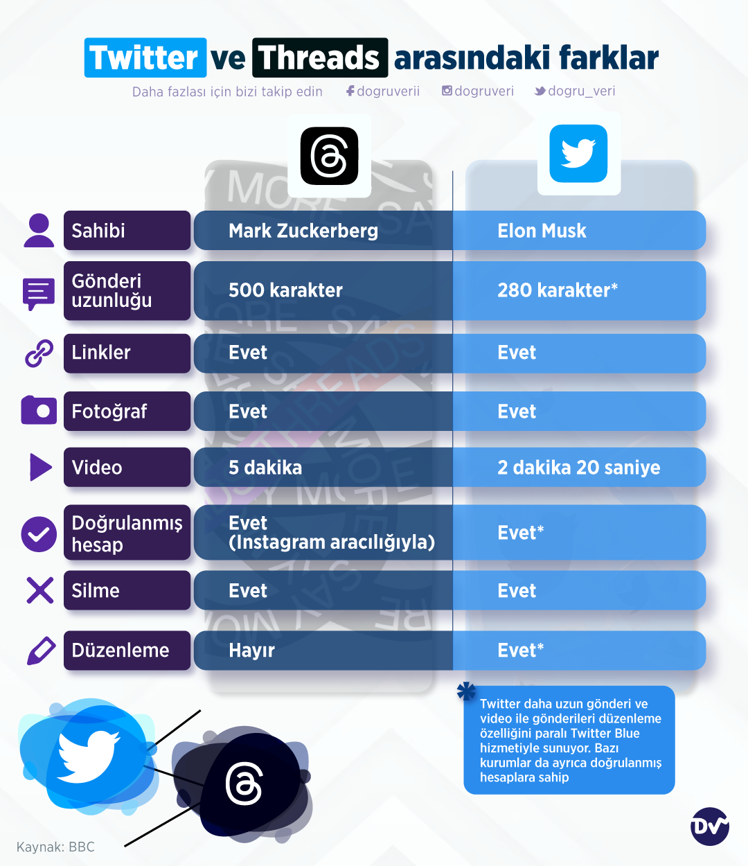 Twitter’a rakip olarak görülen Threads uygulaması bugün kullanıcıların kullanımına açıldı. Twitter ve Threads arasındaki farklar ise merak ediliyor. Sizler için iki uygulama arasındaki farkları ve özelliklerini derledik. Detaylara bakıldığında iki uygulama arasında gönderi uzunluğu, video süresi gibi farklılıklar olduğu görülüyor.