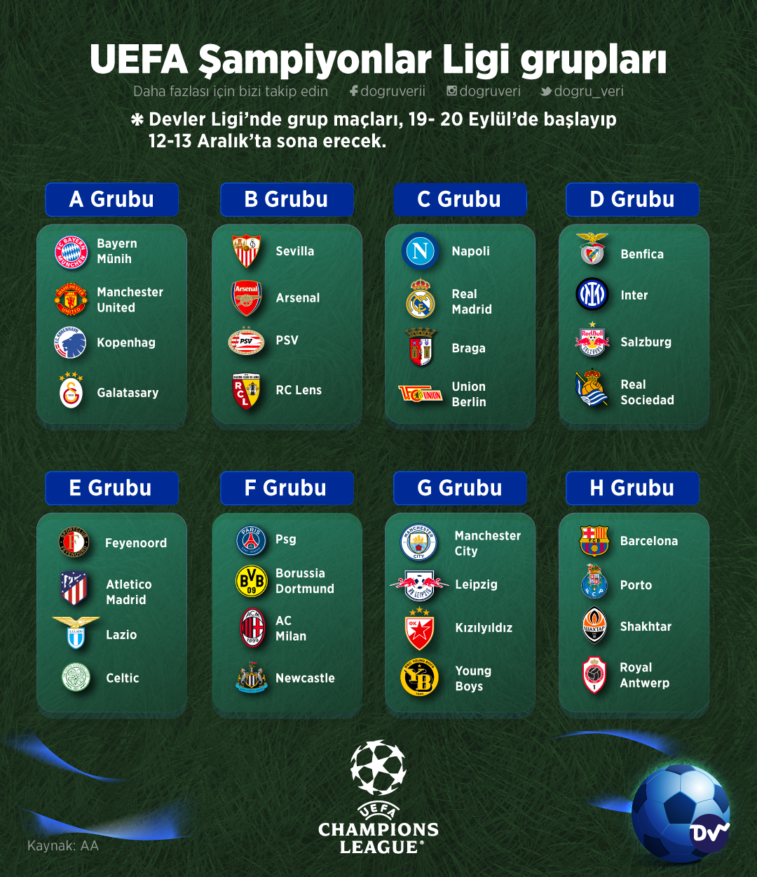 AnasayfaSporUEFA Şampiyonlar Ligi gruplarıSpor UEFA Şampiyonlar Ligi grupları Paylaş 2023-24 UEFA Şampiyonlar Ligi’nde gruplar belli oldu. Futbolseverlerin heyecanla beklediği grup maçları, 19-20 Eylül’de başlayıp 12-13 Aralık’ta sona erecek. Sizler için UEFA Şampiyonlar Ligi gruplarını derledik. 64 Paylaş