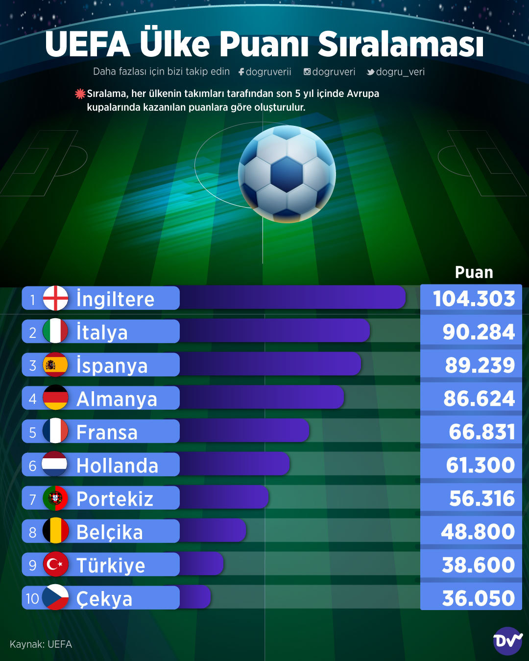 AnasayfaDiğerUEFA Ülke Puanı SıralamasıDiğer UEFA Ülke Puanı Sıralaması Paylaş Ülkelerin UEFA puanlarını sıraladık. Sıralama son 5 yıldaki Avrupa kupalarındaki başarı oranlarına göre yapılmış. Listenin ilk üç sırasında İngiltere, İtalya ve İspanya yer alıyor. Türkiye ise 9. sırada bulunuyor. 545 Paylaş