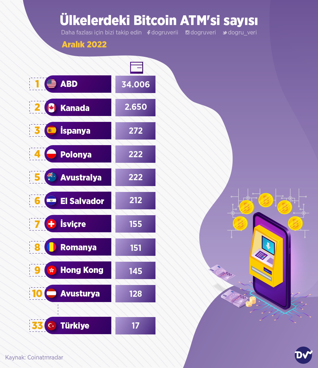 Aralık 2022 verilerine göre ülkelerdeki Bitcoin ATM’si sayılarını derledik. Buna göre, en fazla Bitcoin ATM’sine sahip ülke yaklaşık 34 bin ATM ile ABD olurken 2. sırada 2650 ATM ile Kanada ve 3. sırada 272 ATM ile İspanya yer aldı. Türkiye ise listede 17 ATM ile 33. sırada yer aldı.