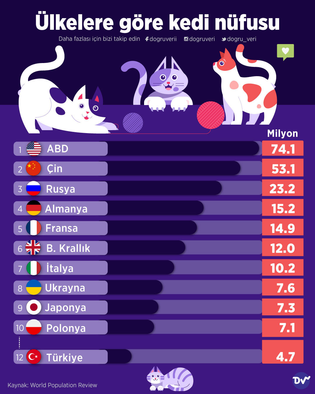 Kediseverler için ilginç bir liste hazırladık, işte bazı ülkelerdeki kedi nüfusu! Kediler dünya üzerinde büyük bir nüfusa sahipler. Peki en çok hangi ülkelerde kedi var? World Population Review’e göre en fazla kediye sahip ülkelerin başında 74.1 milyon ile ABD, 53.1 ile Çin var. Türkiye, 4.7 milyon kedi ile 12. sırada.
