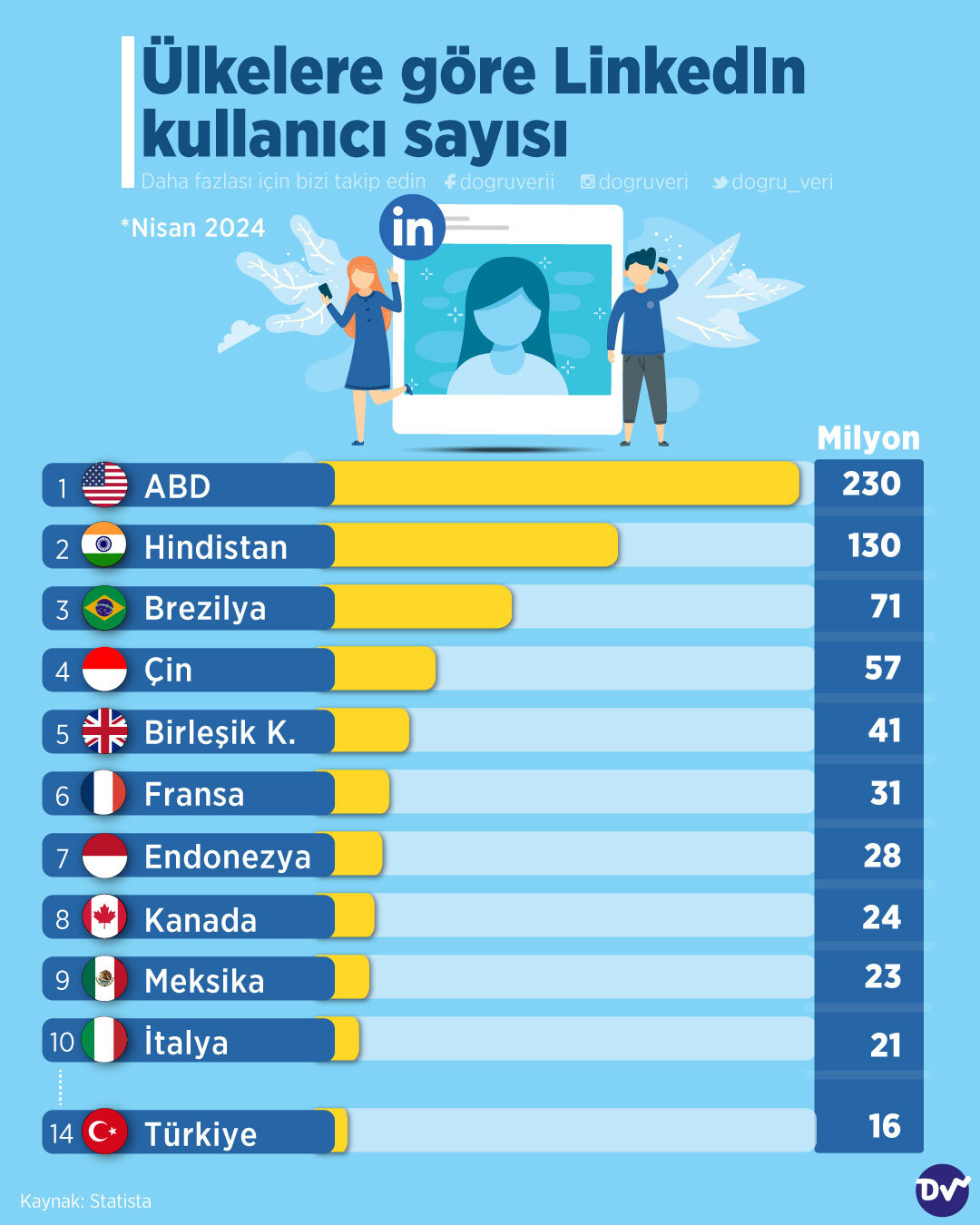 LinkedIn, dünyanın farklı yerlerindeki profesyonellerin bağlantı kurmasını sağlayan çevrimiçi bir platformdur. Statista’dan aldığımız verilere göre ülkelerdeki LinkedIn kullanıcı sayılarını araştırdığımızda Türkiye’de 16 milyon kişinin LinkedIn hesabı olduğu görülüyor.