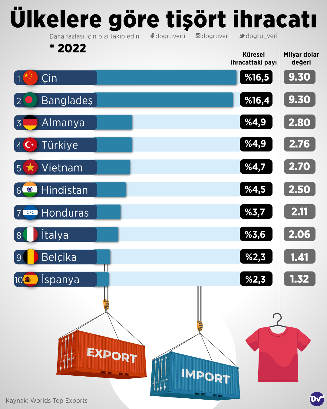 AnasayfaÜretim & TüketimÜlkelere göre tişört ihracatı I 2022Üretim & TüketimEkonomi Ülkelere göre tişört ihracatı I 2022 Paylaş Ülkelerin tişört ihracatındaki paylarını araştırdık. Worlds Top Exports’un açıkladığı verilere göre Çin, Bangladeş ve Almanya tişört ihracatında öne çıkan ülkeler arasında. Türkiye’nin tişört ihracatı pazarındaki payı ise %4,9. 70 Paylaş
