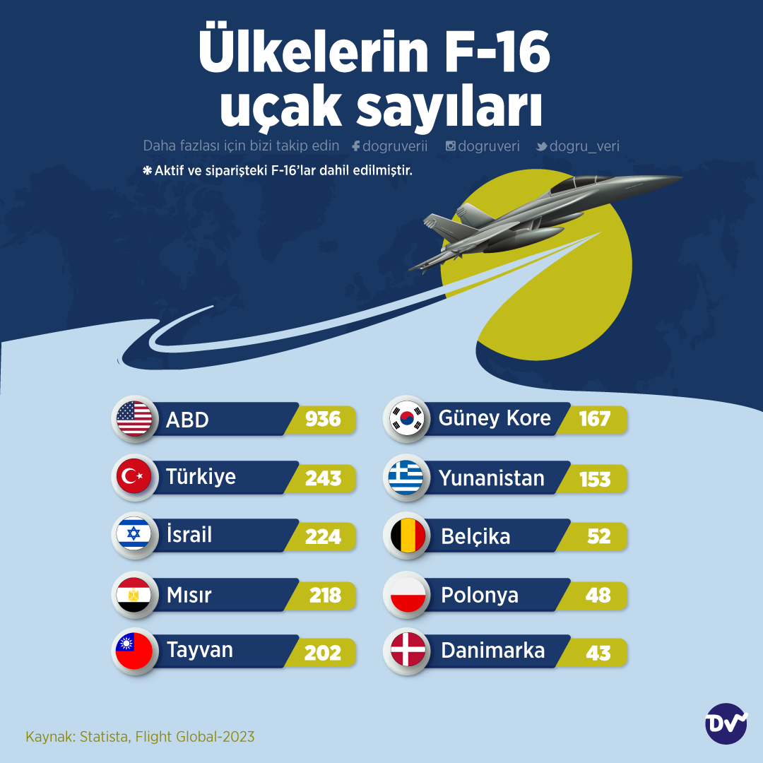 AnasayfaDiğerÜlkelerin F-16 uçak sayılarıDiğer Ülkelerin F-16 uçak sayıları Paylaş Statista ve Flight Global’den derlediğimiz verilere göre ülkelerin F-16 uçak sayılarını derledik. ABD 936 adet F-16 uçak sayısıyla13ilk sırada yer alırken onu 243 adet F-16 ile Türkiye takip ediyor. 531 Paylaş