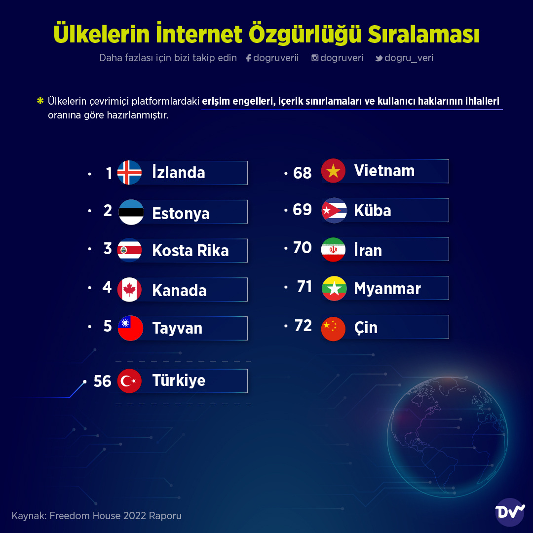 Freedom House’un 2022 raporunda ülkeler, internet özgürlüğüne sıralanmış. Burada özgürlük kriteri olarak erişim engelleri, içerik sınırlamaları ve kullanıcı haklarının ihlalleri oranı baz alınmış. İzlanda, Estonya ve Kosta Rika; listenin en özgür ülkeleri.