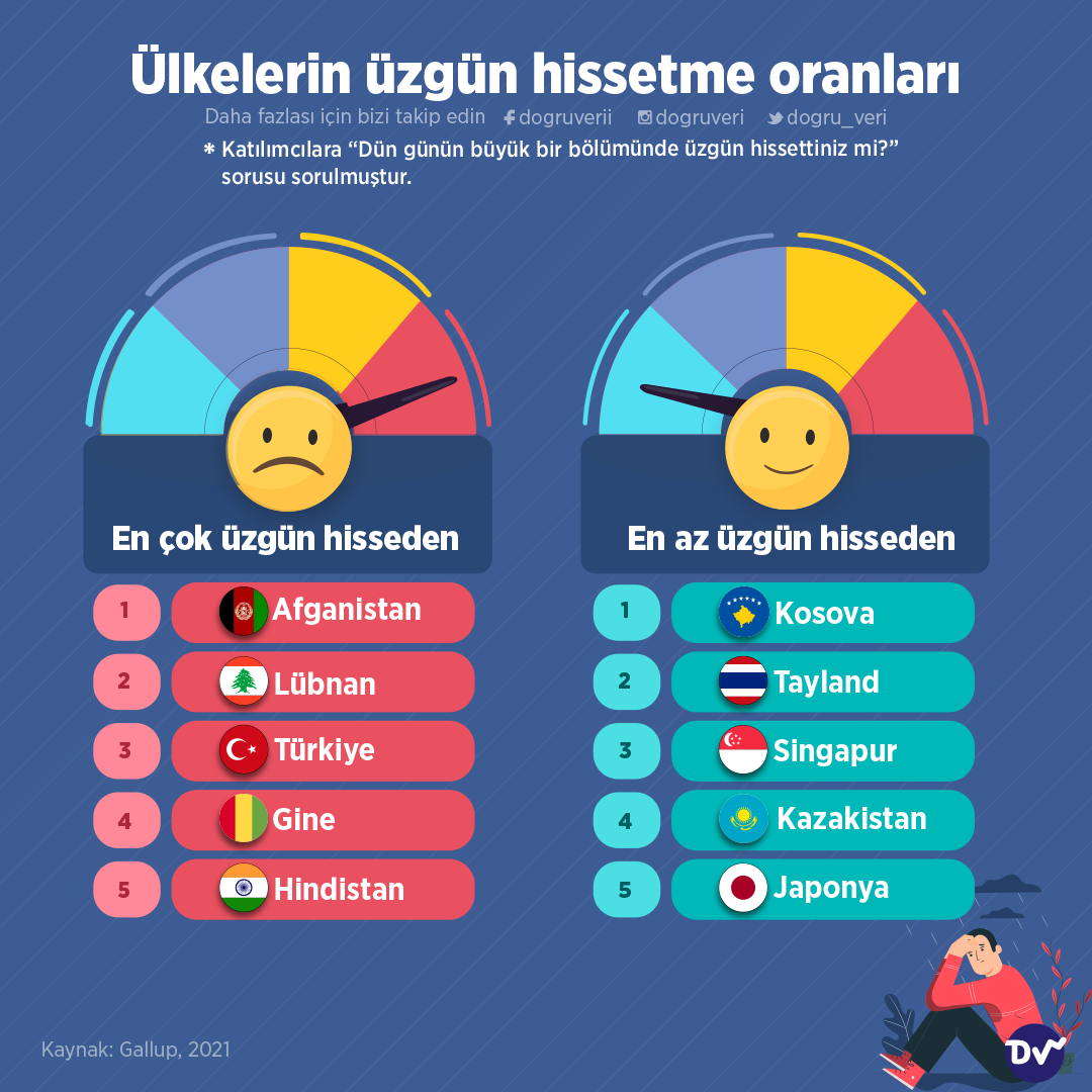 AnasayfaDiğerÜlkelerin üzgün hissetme oranlarıDiğer Ülkelerin üzgün hissetme oranları Paylaş Ülkelerin üzgün hissetme oranlarının derledik. Buna göre En çok üzgün hisseden ülkeler Afganistan, Lübnan, Türkiye, Gine ve Hindistan olurken En az üzgün hisseden ülkeler ise Kosova, Tayvan, Singapur, Kazakistan ve Japonya oldu. 221 Paylaş