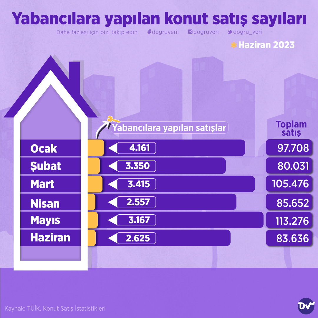 TÜİK Konut Satış İstatistikleri Haziran 2023 raporuna göre ocak ve haziran ayları arasında yabancılara yapılan konut satış sayılarını inceledik. Buna göre, yabancılara yapılan satışlar ocak ayında 4.161, haziran ayında 2.625 konut satışı oldu. Türkiye genelinde ise haziran ayında 83.636 konut satıldı.