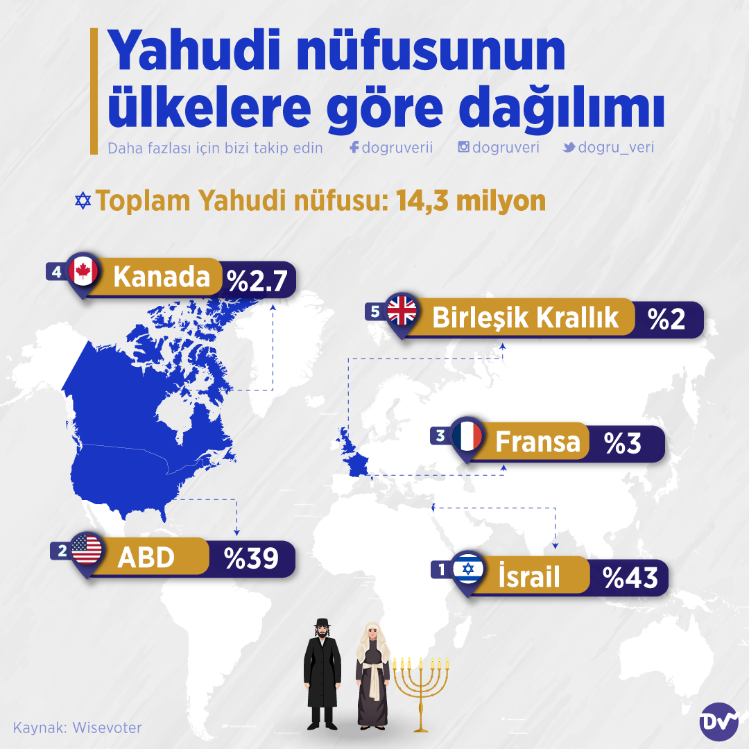 AnasayfaDinYahudi nüfusunun ülkelere göre dağılımıDin Yahudi nüfusunun ülkelere göre dağılımı Paylaş Wisevoter verilerine göre Yahudiler dünya üzerinde en çok İsrail’de yaşıyor. İsrail’i Amerika Birleşik Devletleri takip ederken Fransa, Kanada ve Birleşik Krallık küçük oranlarla da olsa listenin başlarında yer alıyorlar. 540 Paylaş