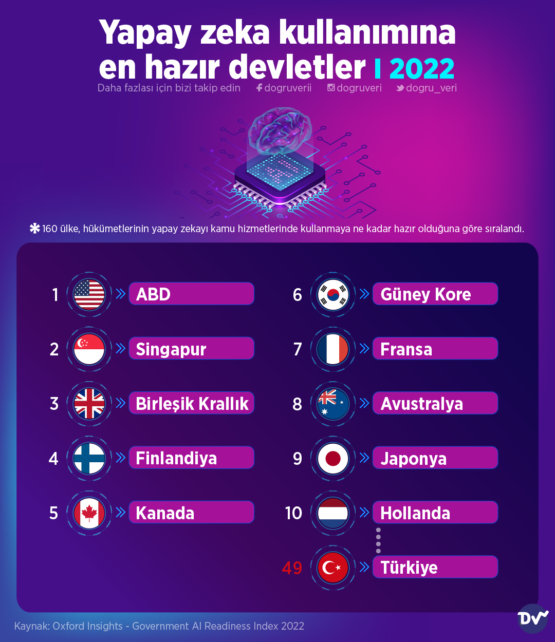 160 ülke, hükümetlerinin yapay zekayı kamu hizmetlerinde kullanmaya ne kadar hazır olduğuna göre sıralandı. Sıralamaya göre ABD listenin başında yer alırken Singapur 2. sırada, Birleşik Krallık 3. sırada yer aldı. Türkiye ise listede 49. sırada yer aldı.