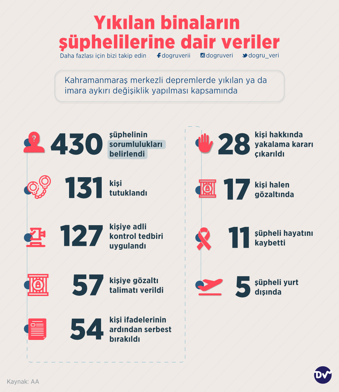 Anadolu Ajansı’nın paylaştığı bilgilere göre, Kahramanmaraş merkezli depremlerde yıkılan binaların şüphelilerine dair verileri derledik. Buna göre, şu ana kadar 430 şüphelinin sorumlulukları belirlenirken 131 kişi tutuklandı ve 127 kişiye ise adli kontrol tedbiri uygulandı.