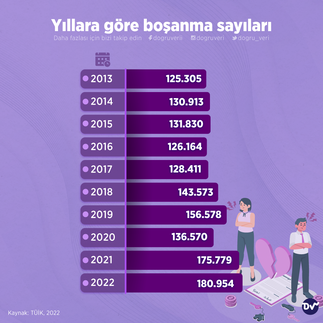 AnasayfaDiğerYıllara göre boşanma sayılarıDiğer Yıllara göre boşanma sayıları Paylaş TÜİK verilerini baz alarak 2013 ve 2022 yılları arasındaki boşanma sayılarını derledik. Buna göre, 2013 yılında yaklaşık 125 bin boşanma gerçekleşirken 2022 yılında ise yaklaşık 181 bin boşanma gerçekleştiği görülüyor. 172 Paylaş