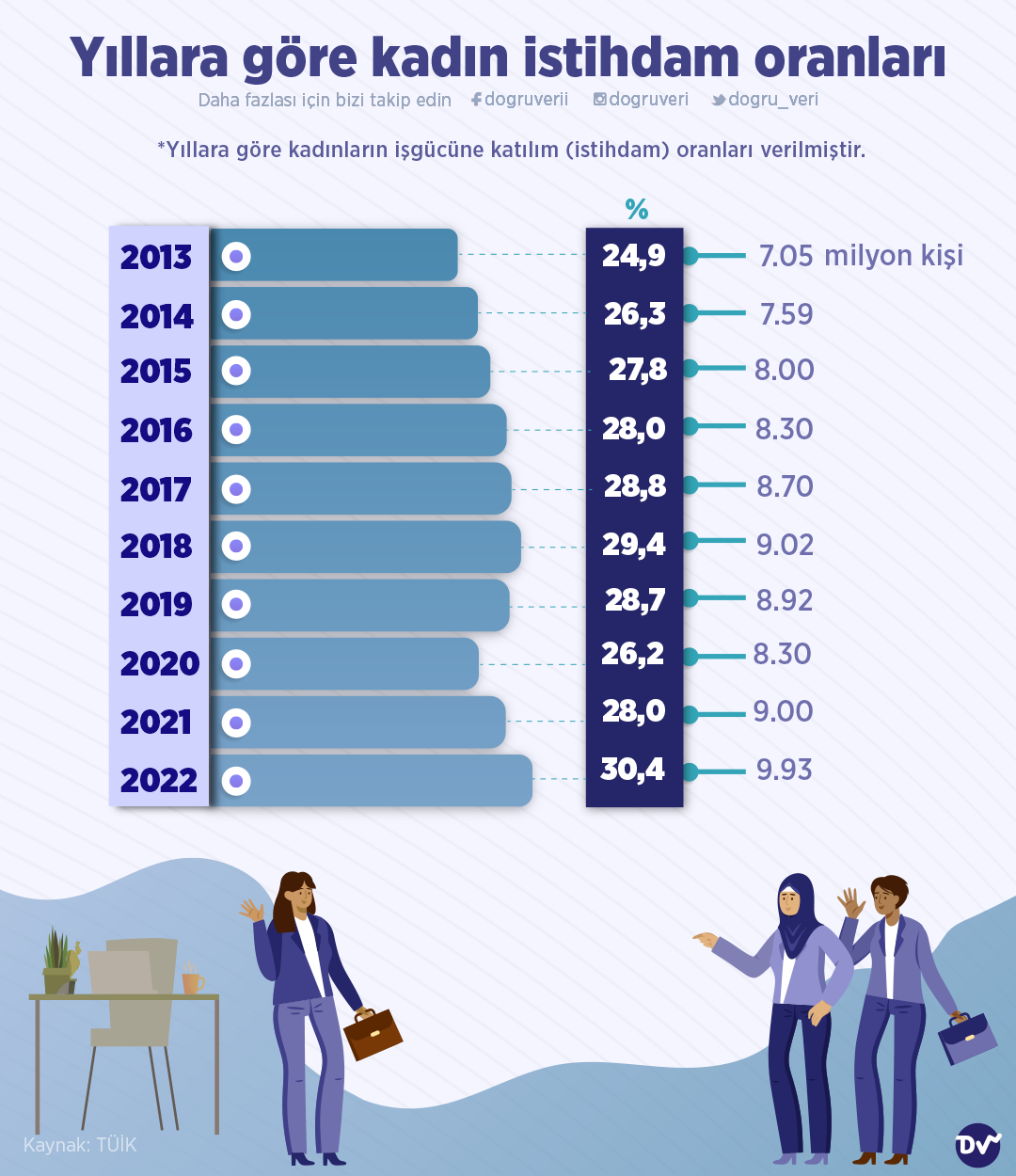 AnasayfaÜretim & TüketimYıllara göre kadın istihdam oranlarıÜretim & Tüketim Yıllara göre kadın istihdam oranları Paylaş TÜİK verilerini baz alarak yıllara göre kadın işgücüne katılım oranlarını derledik. Buna göre, 2013 yılında kadın istihdam oranının yüzde 24,9 olduğu görülürken 2022 yılında yüzde 30,4 olduğu görülüyor. 561 Paylaş