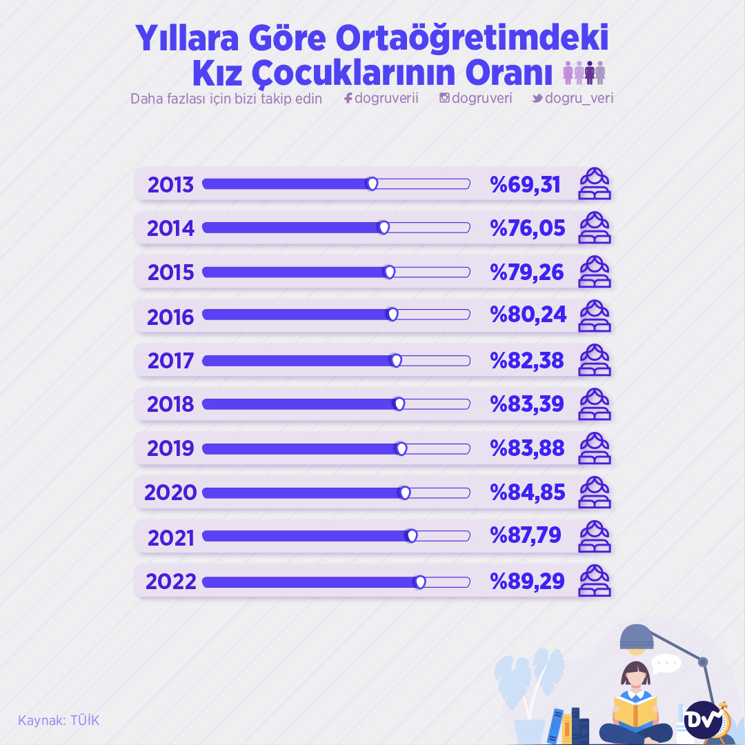 TÜİK raporuna göre kız çocuklarının ortaöğretime katılım oranı her yıl artıyor. Son 10 yıllık süreci incelediğimizde 2013 ile 2022 arasında %20’lik bir artış olduğunu takip edebiliyoruz. 2013 yılında ortaöğretimdeki kız çocuklarının oranı %69,31’ken 2022’de bu oran %89,29’a yükselmiş.
