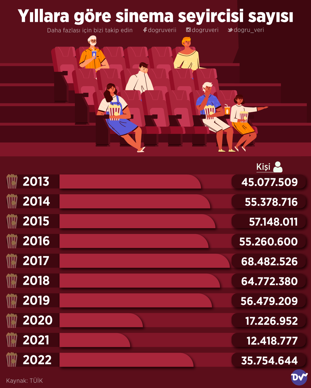 AnasayfaKültür & SanatYıllara göre sinema seyircisi sayısıKültür & Sanat Yıllara göre sinema seyircisi sayısı Paylaş Sinema seyircileri yıllara göre nasıl değişti? Pandeminin etkisi grafikten anlaşılıyor. 48 Paylaş