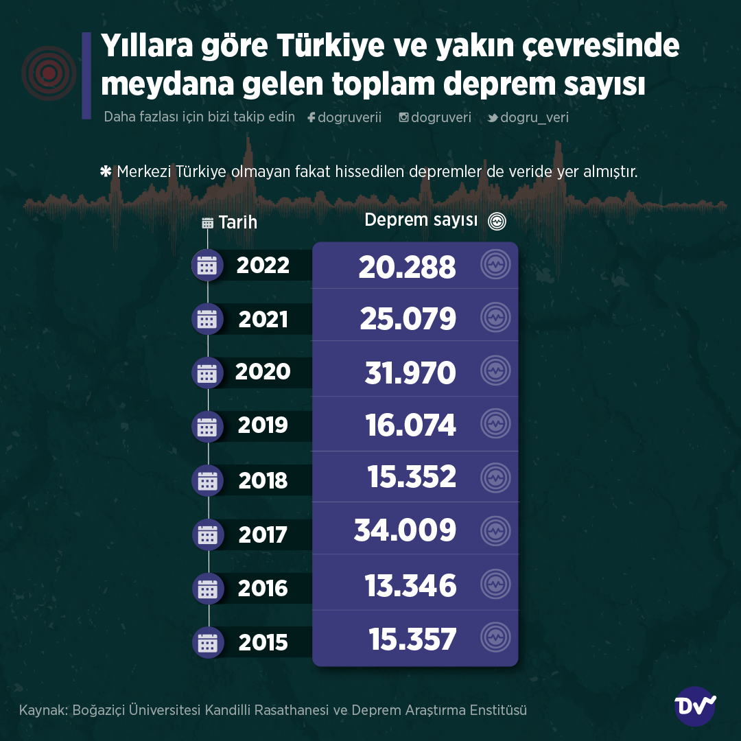 2015 ve 2022 yılları arasında Türkiye ve yakın çevresinde gerçekleşen toplam deprem sayısını derledik. Buna göre geçtiğimiz yıl toplam 20 bin 288 deprem meydana geldiği görülüyor.