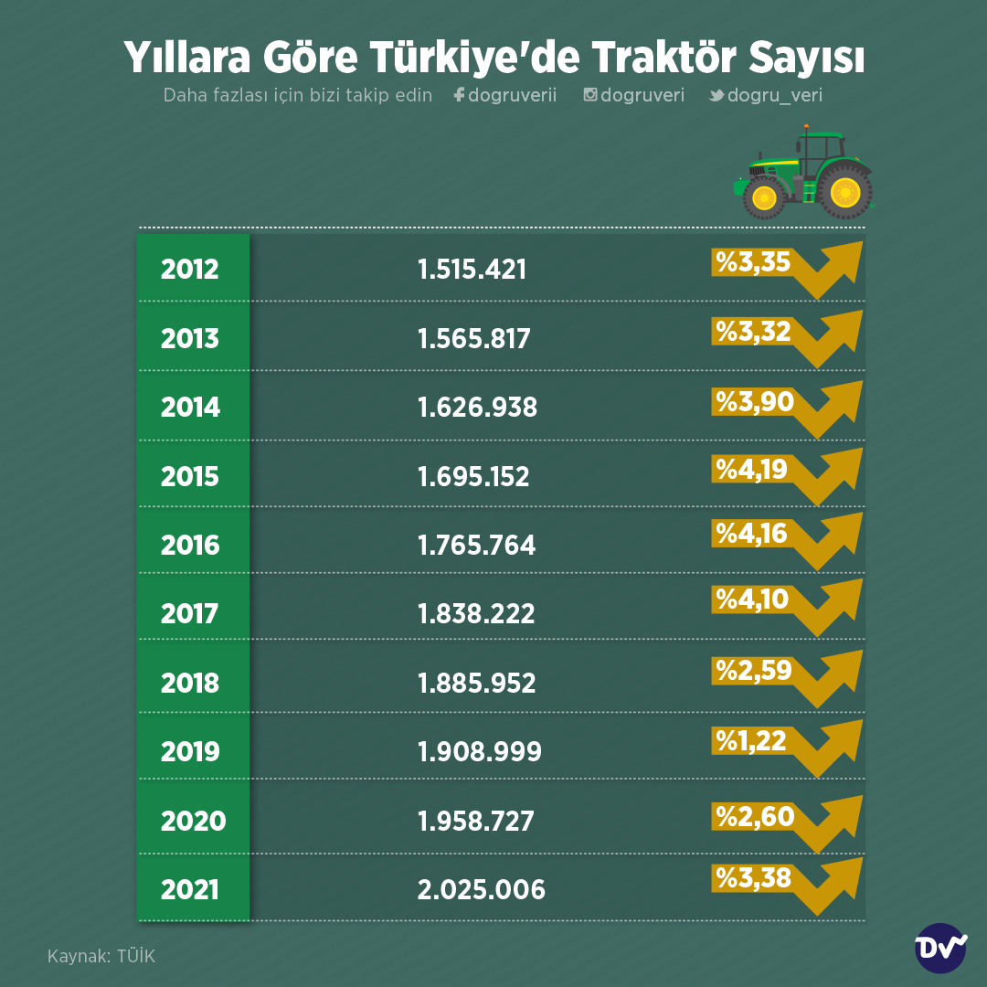 TÜİK’in Türkiye’deki traktör sayısının yıllar içindeki değişimini verdiği listeye göre 2012 yılında 1 milyon 515 bin 421 adet olan traktör sayısı, 2021 yılında 2 milyon 25 bin 6’ya yükselmiş. Bu da 10 yıllık süre içinde traktör sayısında %33,62’lik artış olduğunu gösteriyor.